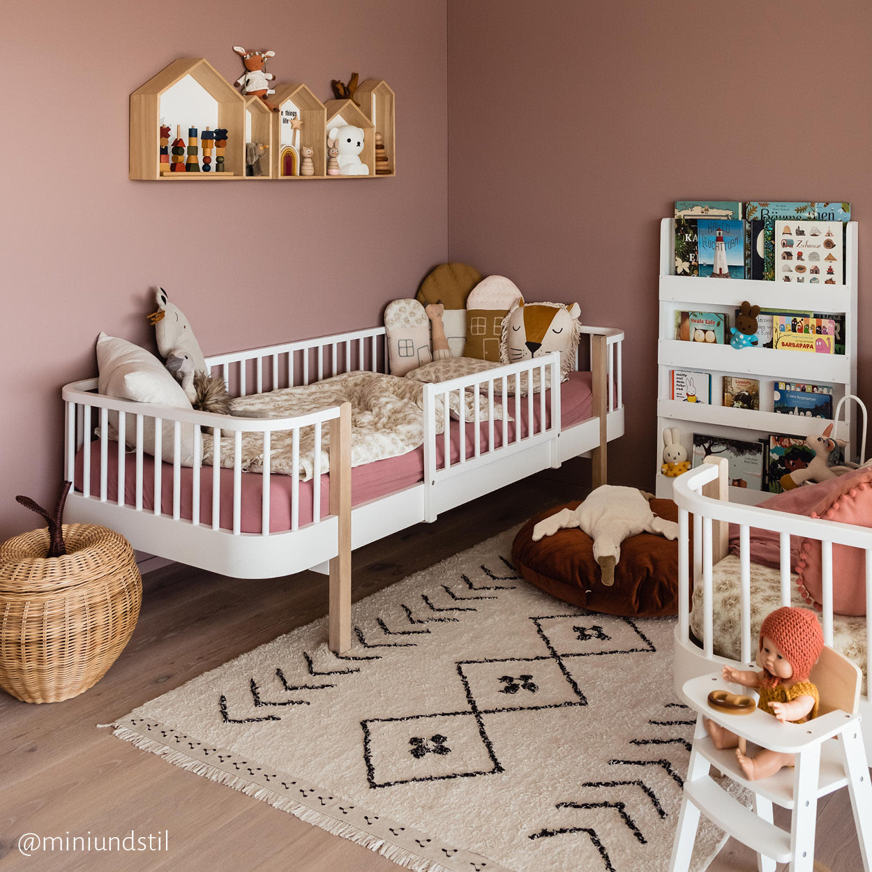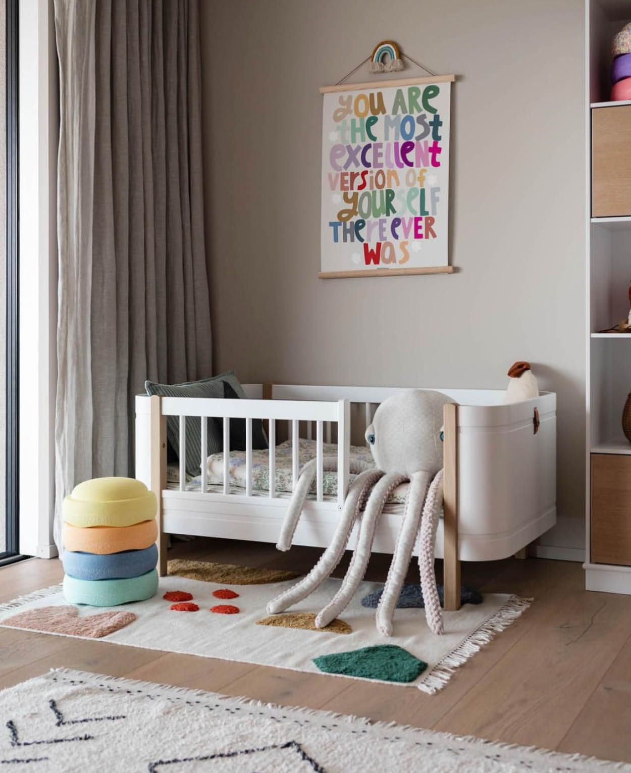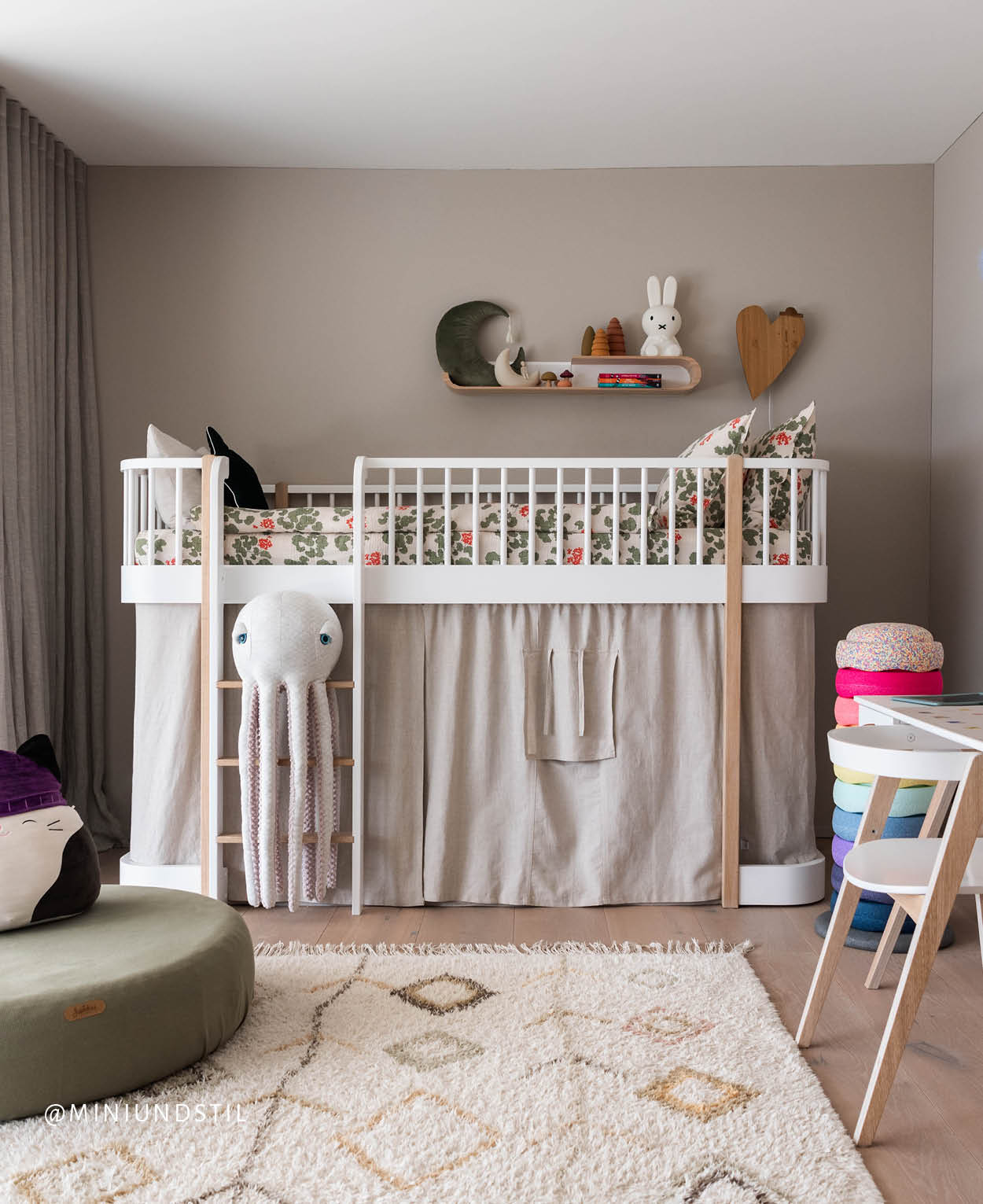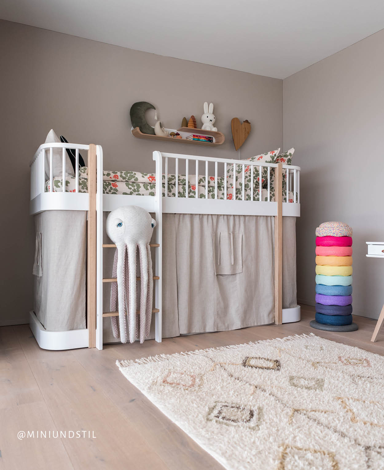 It was in her youngest daughter's baby room large changing table and the Wood Mini+ baby bed from Oliver Furniture. With a conversion set, the baby bed can easily be converted into a junior bed after the baby is over. Look how beautifully Isabelle styled the bed.