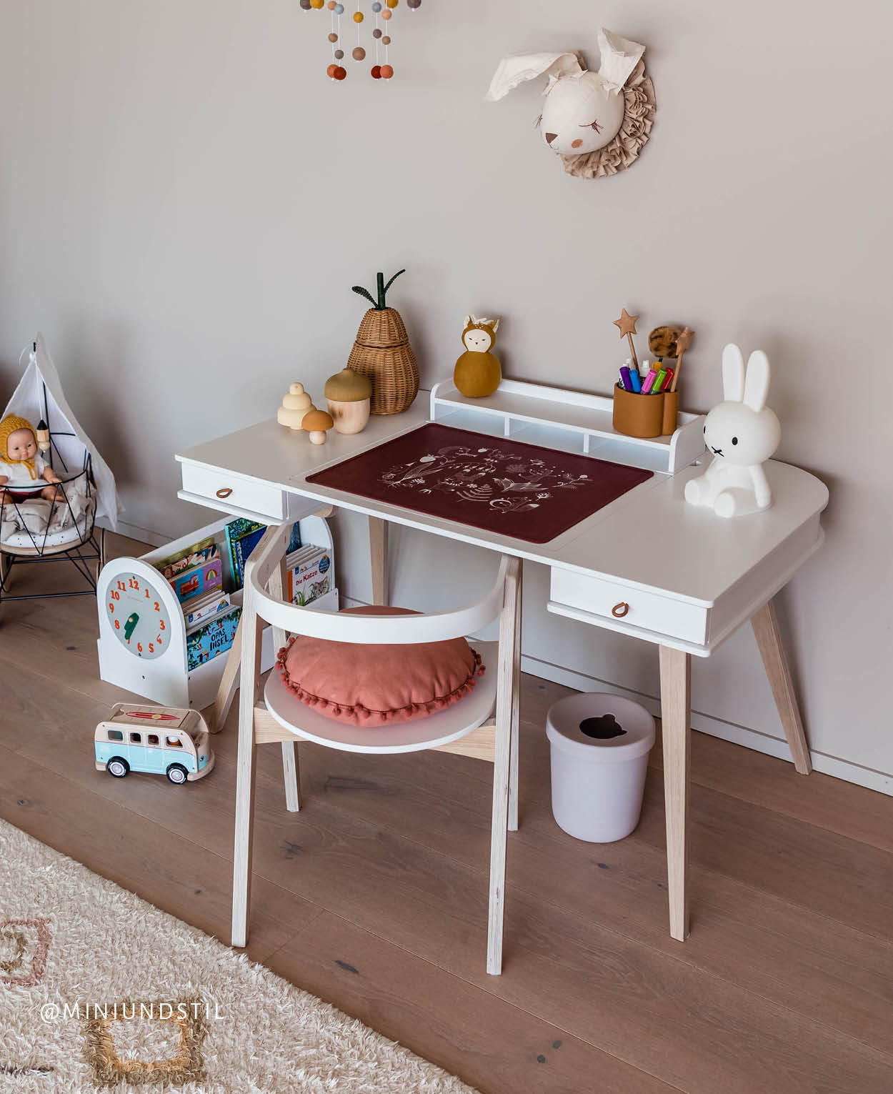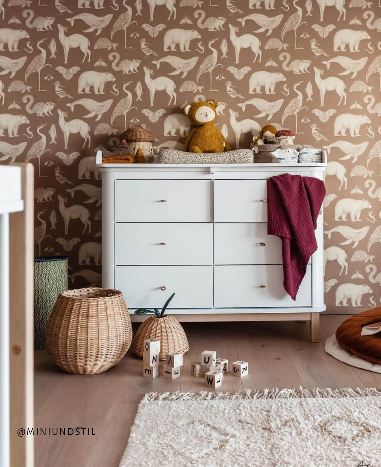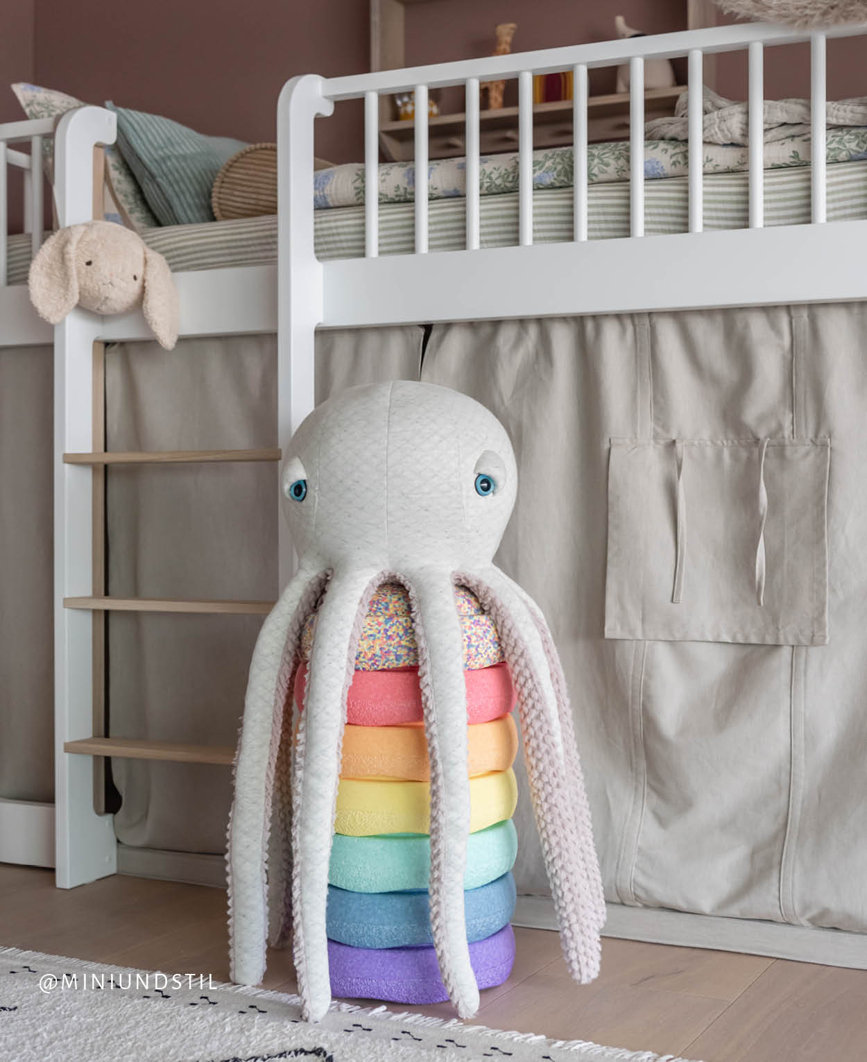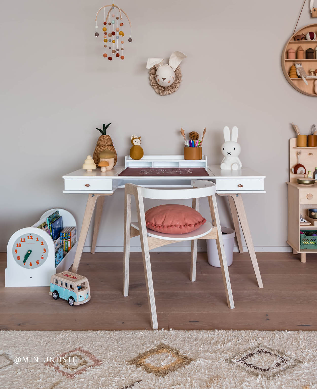 It was in her youngest daughter's baby room large changing table and the Wood Mini+ baby bed from Oliver Furniture. With a conversion set, the baby bed can easily be converted into a junior bed after the baby is over. Look how beautifully Isabelle styled the bed.
